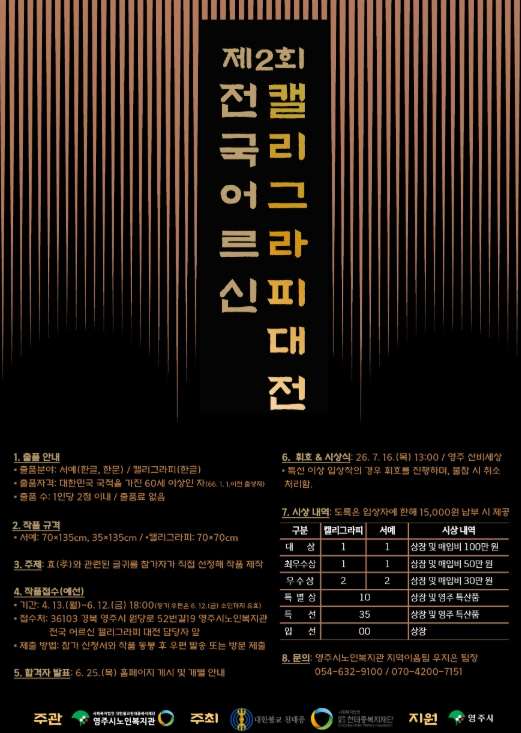 [고타야뉴스=이은희기자] 천태종복지재단 산하 영주시노인복지관은 어르신들의 문화예술 참여 기회를 확대하고 창작 활동을 지원하기 위해 `제2회 전국 어르신 캘리그라피 대전`을 개최한다.