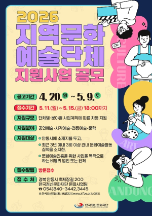 [고타야뉴스=권세헌기자]안동시 한국정신문화재단은 5월 11일부터 5월 15일 18시까지 관내 문화예술단체를 대상으로 ‘지역문화예술단체 지원사업’ 참여단체를 공개 모집한다.