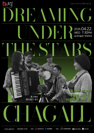 • 행 사 명 : 별 헤는 미술관 – 예술의 시대Ⅳ• 프로그램 : 샤갈의 별 헤는 밤 (Patchwork Road)• 일 시 : 2026년 4월 22일(수) 19:30• 장 소 : 송강미술관 야외공연장• 대 상 : 전연령• 참여 방법 : 사전 신청 및 현장 접수• 문 의 : 송강미술관 (054-854-2110)• 홈페이지 : www.sgma.kr