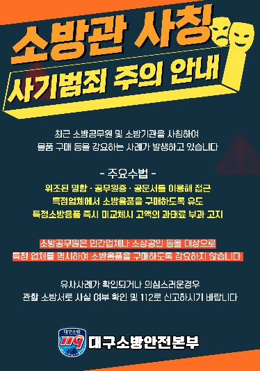 | ↑↑ 소방공무원 사칭 소방용품 판매 사기 주의 당부 |