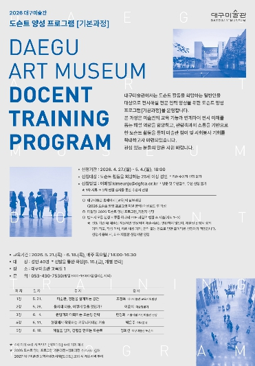 [고타야뉴스=이은희기자] 대구문화예술진흥원 대구미술관은 도슨트 활동을 희망하는 25세 이상 일반인을 대상으로 전시 해설 전문 인력 양성을 위한 ‘도슨트 양성 프로그램(기본과정)’을 운영하고, 2026년 교육생을 모집한다.