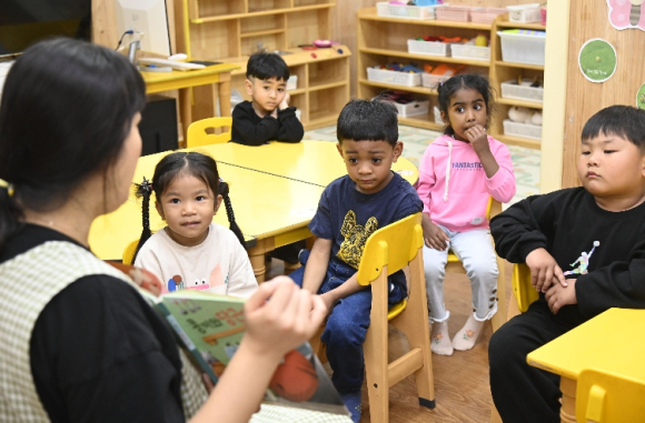 | ↑↑ 대구 최초 외국 아동 누리보육료 완전 지원 실현 사진 1(지난 20일 대구 달성군 논공읍의 한 어린이집에서 수업을 듣고 있는 외국인 아동들.) |