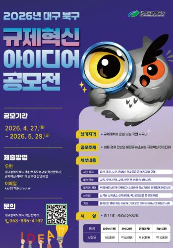 배광식 북구청장은 “작은 아이디어 하나가 구민의 삶을 바꾸는 큰 변화의 시작이 될 것”이라며, “현장의 불필요한 규제 장벽을 걷어내 지역 경제에 활력을 불어넣을 수 있도록 참신한 아이디어를 가진 많은 분들의 참여를 바란다”라고 말했다.