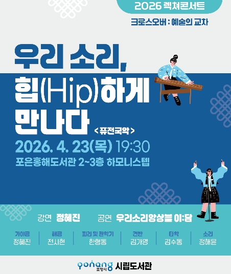 [고타야뉴스=손찬범기자] 포항시는 오는 23일 포은흥해도서관 하모니스텝에서 ‘2026 렉쳐콘서트 - 크로스 오버 : 예술의 교차’의 첫 시간 ‘우리 소리, 힙(Hip)하게 만나다’를 운영한다.