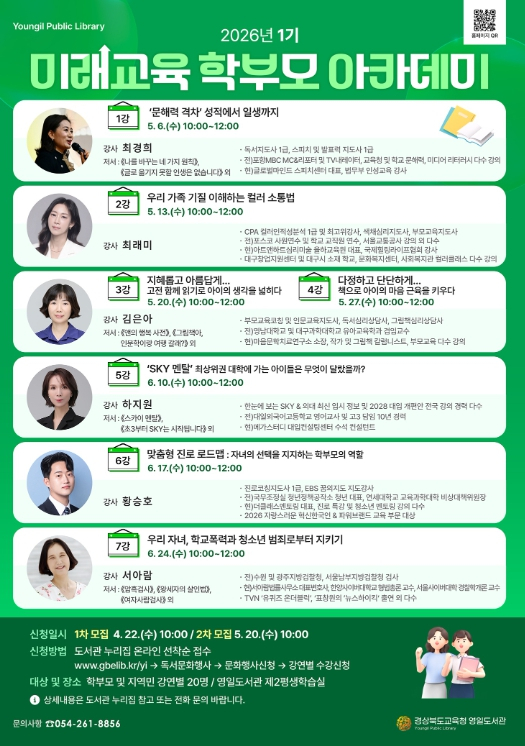 [고타야뉴스=손찬범기자] 경상북도교육청 영일도서관은 오는 5월 6일부터 학부모 및 지역주민을 대상으로 ‘2026 1기 미래교육 학부모 아카데미’를 운영하고 수강생을 모집한다.