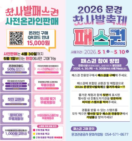 축제추진위원회 관계자는 “올해 패스권은 관광객들이 문경의 따뜻한 정과 도자기 문화를 부담 없이 만끽할 수 있도록 세심하게 준비했다”며 “가정의 달 5월, 문경새재의 신록 속에서 가족, 연인과 함께 특별한 추억을 만드시길 바란다”고 전했다.