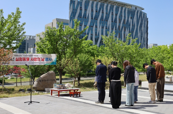 전임상센터 동물사랑비 앞에서 진행된 행사에는 박구선 이사장을 비롯한 전임상센터 연구원 50여 명이 참석한 가운데 추모문 낭독 및 묵념, 헌화 순으로 진행됐다.