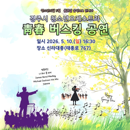 김유경 경주시 아동청소년과장은 “이번 공연은 청소년 단원들이 꾸준히 준비해 온 연주를 시민과 관광객에게 선보이는 자리”라며 “봄날 야외에서 펼쳐지는 청소년오케스트라 버스킹 공연에 많은 관심과 참여를 부탁드린다”고 말했다.
