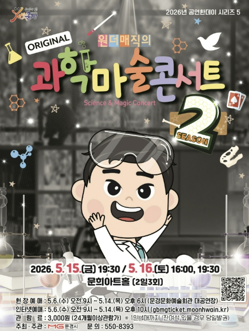 [고타야뉴스=유영우기자]문경문화예술회관에서는 5월 어린이 달을 맞아 마술과 과학의 경계를 넘나들며 온가족 모두가 재미있게 관람할 수 있는 과학마술콘서트 시즌2 공연을 5월 15일 19:30, 16 16:00, 19:30 (2일 3회)에 문희아트홀에서 개최한다.
