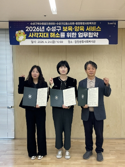 [고타야뉴스=이은희기자]대구 수성구육아종합지원센터(센터장 심영숙)는 지난 24일 수성구 드림스타트센터(센터장 김은미), 함장종합사회복지관(관장 권혁철)과 지역 내 보육·양육 서비스 사각지대 해소를 위한 ‘3자 업무협약(MOU)’을 체결했다고 밝혔다.