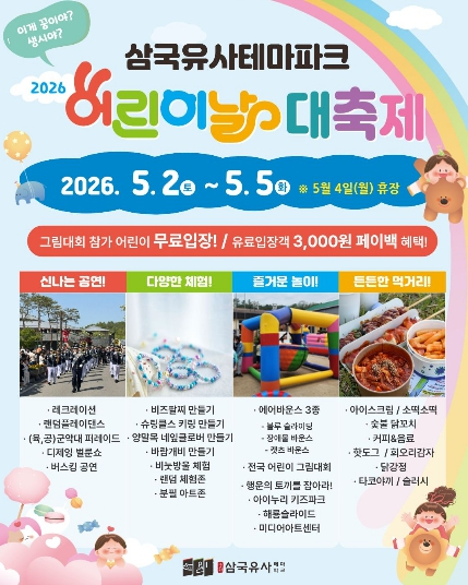 [고타야뉴스=유영우기자]군위문화관광재단이 다가오는‘2026 어린이날 대축제’를 더욱 알차게 즐길 수 있는 상세 일정과 장소별 프로그램을 전격 공개했다.