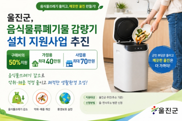 [고타야뉴스=손찬범기자] 울진군은 음식물쓰레기의 발생량 감소와 군민 생활환경 개선을 위해 ‘음식물류폐기물 감량기 설치 지원사업(3차)’을 오는 5월 22일까지 선착순으로 모집한다.