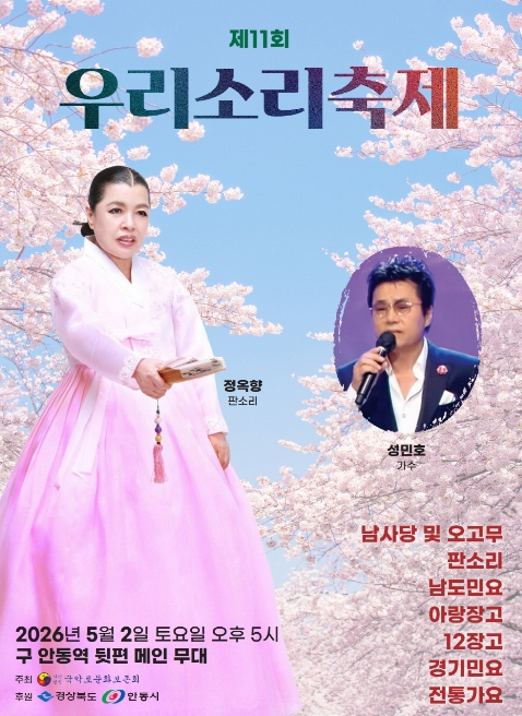 [고타야뉴스=권세헌기자]사단법인 국악로문화보존회가 주최․주관하는 `제11회 우리소리 축제`가 오는 5월 2일 오후 5시 안동 탈춤공원 무대에서 개최된다.