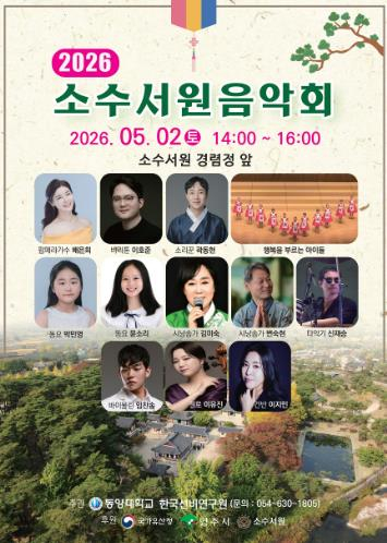 [고타야뉴스=이은희기자]영주시는 오는 5월 2일 오후 2시, 유네스코 세계유산인 소수서원에서 역사와 예술이 어우러지는 ‘소수서원 음악회’를 개최한다고 밝혔다.