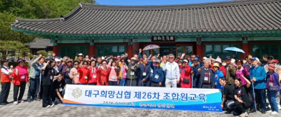 | ↑↑ 대구 희망신협 조합원들이 임고서원에서 영천시 문화관광해설사의 해설을 듣고 관광을 마친 뒤, 기념촬영을 하고 있다 |