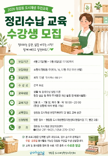 [고타야뉴스=손찬범기자] 포항시 도시재생과는 청림동의 주거 환경을 개선하고 주민 스스로 마을을 돌볼 수 있는 자생력을 키우기 위해 ‘2026 청림동 도시재생 주민교육 : 정리수납 교육 및 집수리 교육’ 참여 주민을 모집한다.