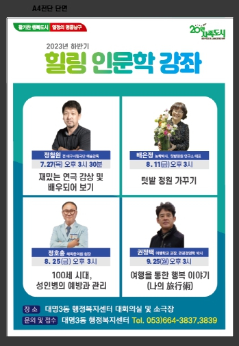 대명3동 힐링 인문학 강의는 2023년 주민참여예산 사업으로 선정되어 무더운 여름을 지나는 지역주민을 위한 건강 관리의 기회를 제공하고자 상․하반기 총 8회의 인문학 힐링 강의를 실시하고 있다.