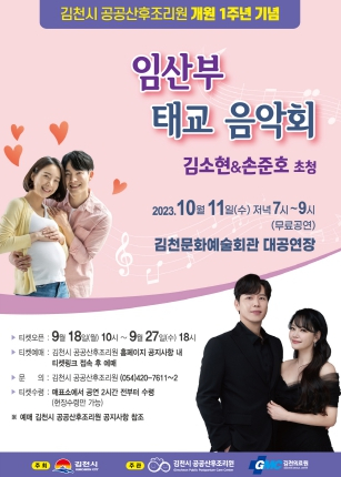 이번 행사는 “임산부의 날(10.10) 행사”와 “김천시 공공산후조리원 건립 1주년”을 기념하기 위한 것으로 풍요와 수확을 상징하는 10월에 대한민국 대표 뮤지컬 배우인 “김소현 & 손준호” 부부를 초청하여 태교에 좋은 감성적 무대를 선보일 예정이며 예비 부모를 위한 임산부 특강도 준비되어 있다.