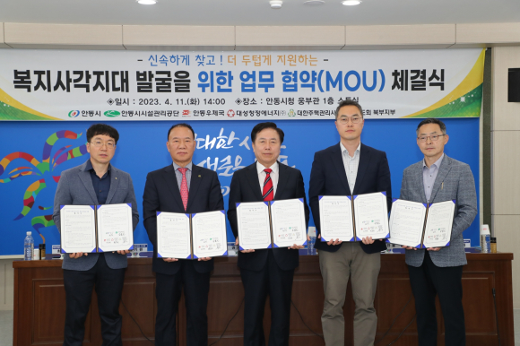 안동시(시장 권기창)는 복지 사각지대 발굴과 위기가구 지원체계 구축을 위해 민관협력의 업무협약(MOU)을 체결했다. 이번 업무협약에는 안동시시설관리공단, 안동우체국, 대성청정에너지㈜, 대한주택관리사협회 경북도회 북부지부가 참여했다.